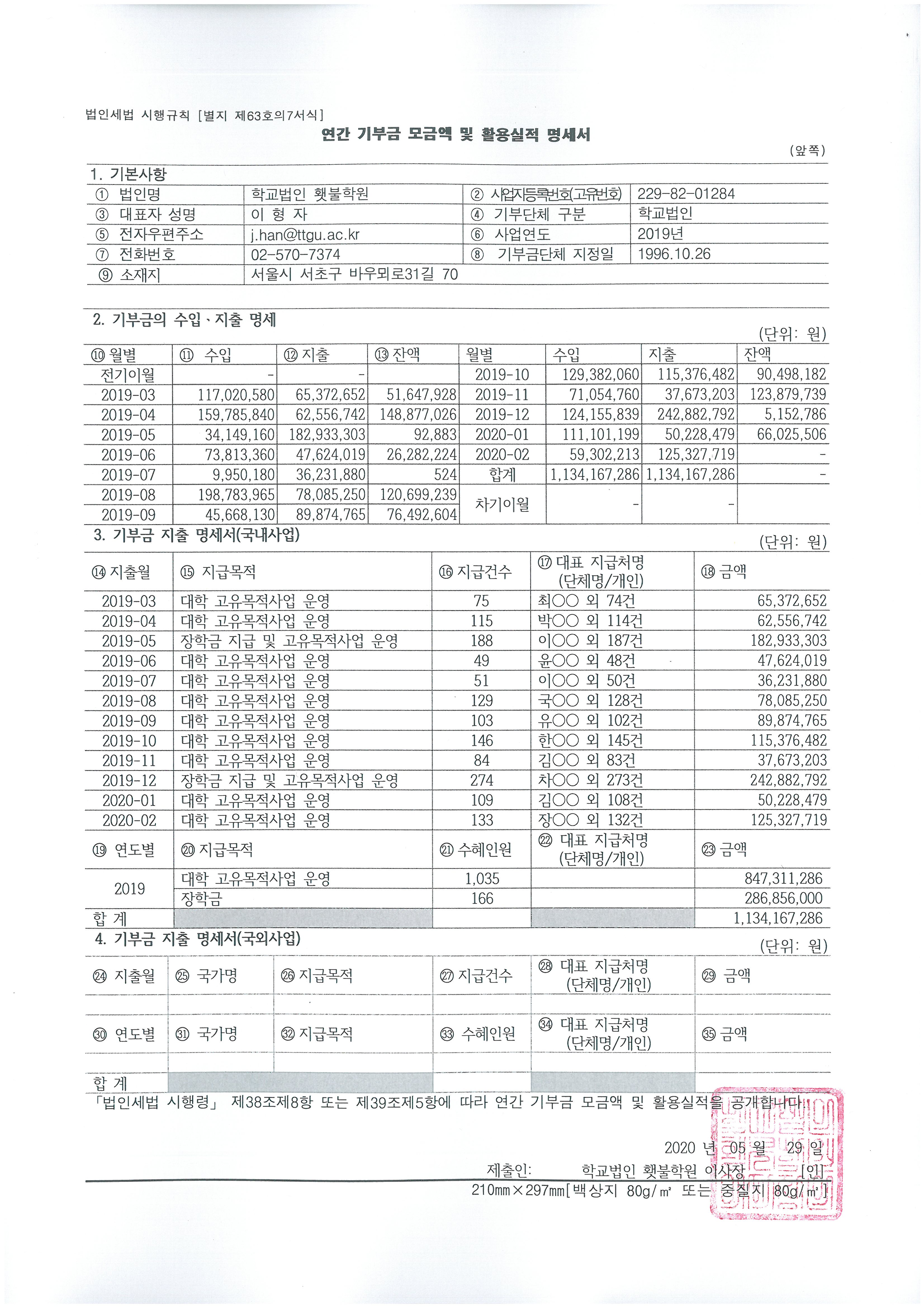 2020학년도 연간 기부금 모금액 및 활용실적 명세서